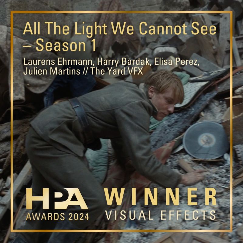 La cérémonie des Hollywood Professional Association (HPA) Awards célèbre les contributions remarquables des équipes et individus du secteur de la post-production mondiale, en mettant en lumière l’excellence artistique et technique dans le contenu de divertissement. The Yard remporte le prix HPA 2024 des Meilleurs Effets Visuels dans un Épisode ou Saison d'une Série pour son travail sur la mini-série Netflix "All The Light We Cannot See" !